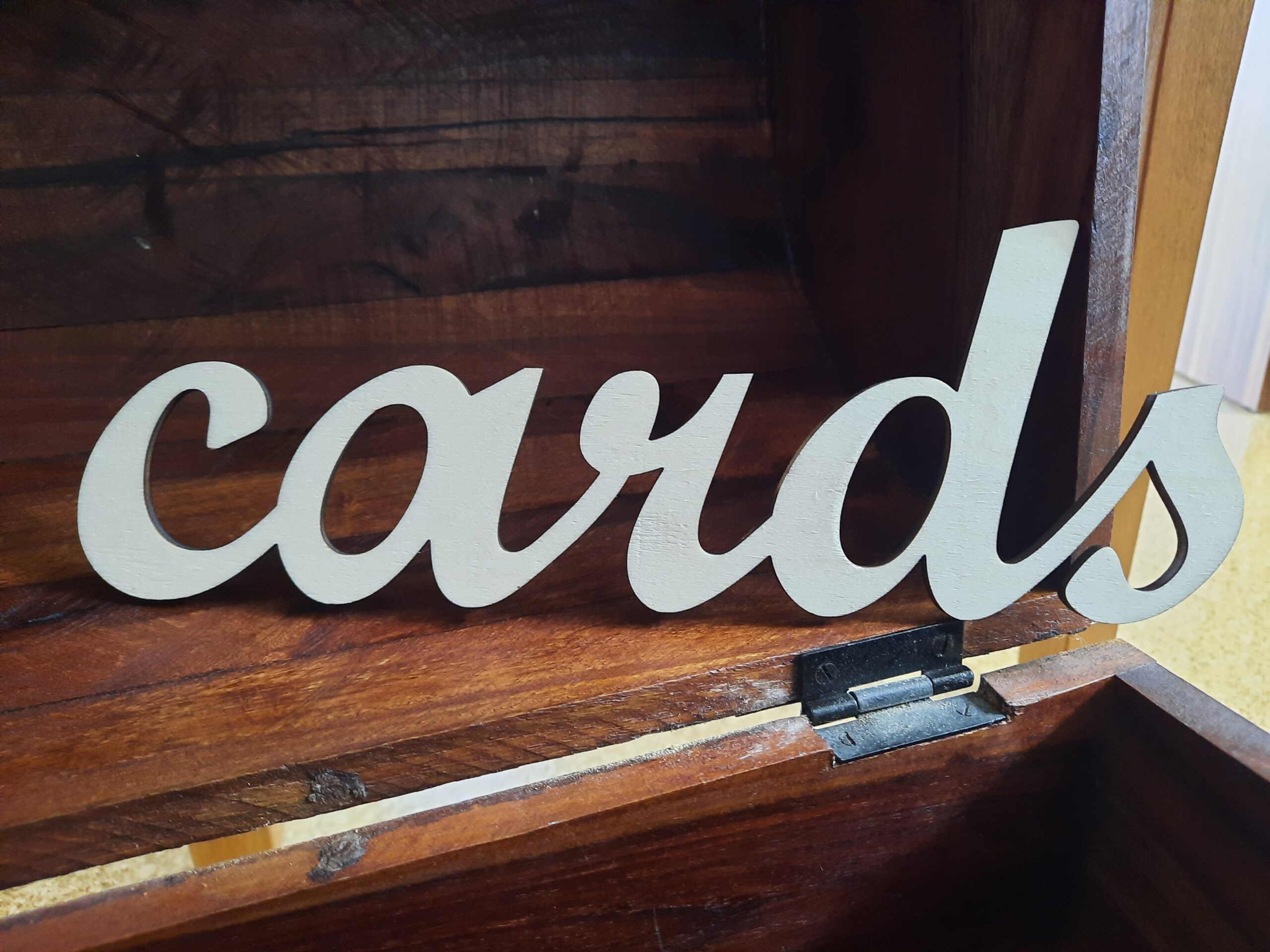 Stellen Sie eine Truhe auf ihren Geschenketisch und dekorieren Sie diese mit dem cards Schriftzug – so finden auch die Geschenkekarten ihrer Gäste den richtigen Weg zur Feier.